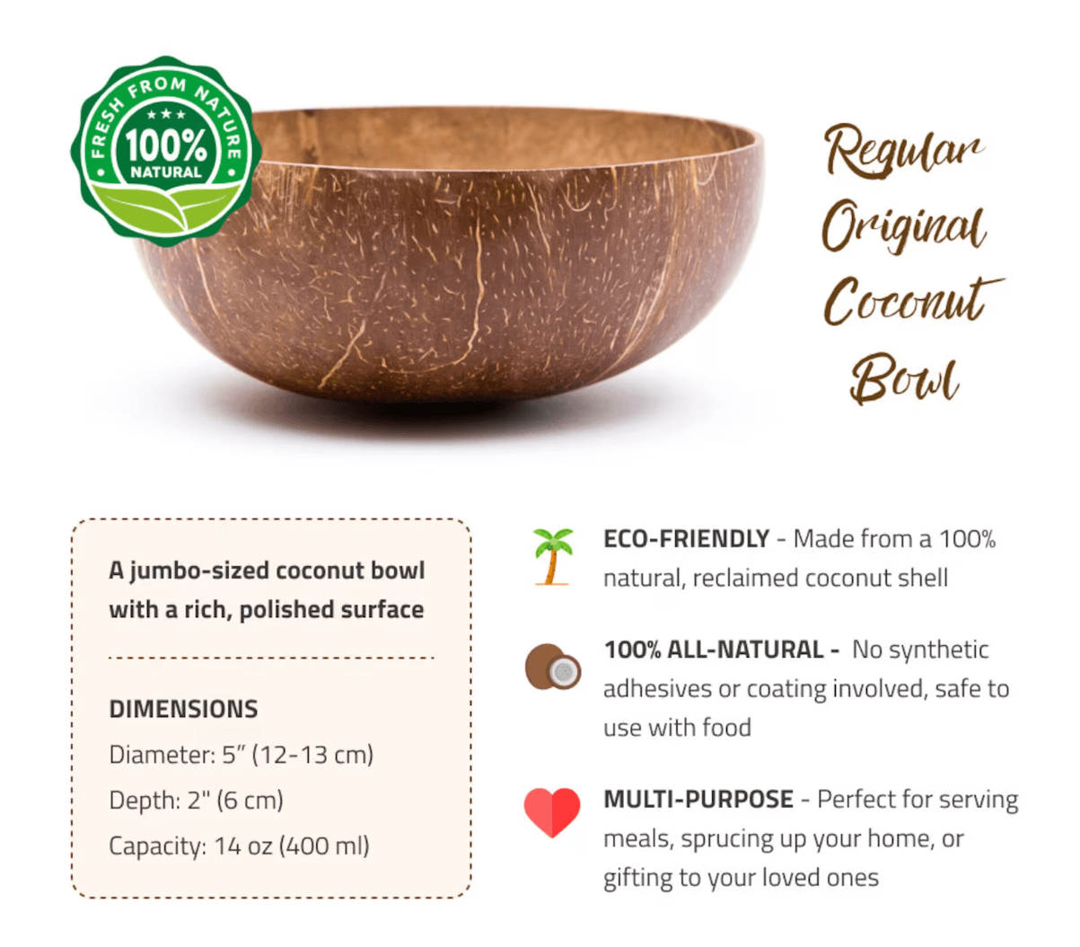 1,Made from 100% Real Coconuts which are collected, cut, cleaned, sanded and finished with a polish with organic coconut oil. All made by hand by Artisans with absolutely no chemicals.